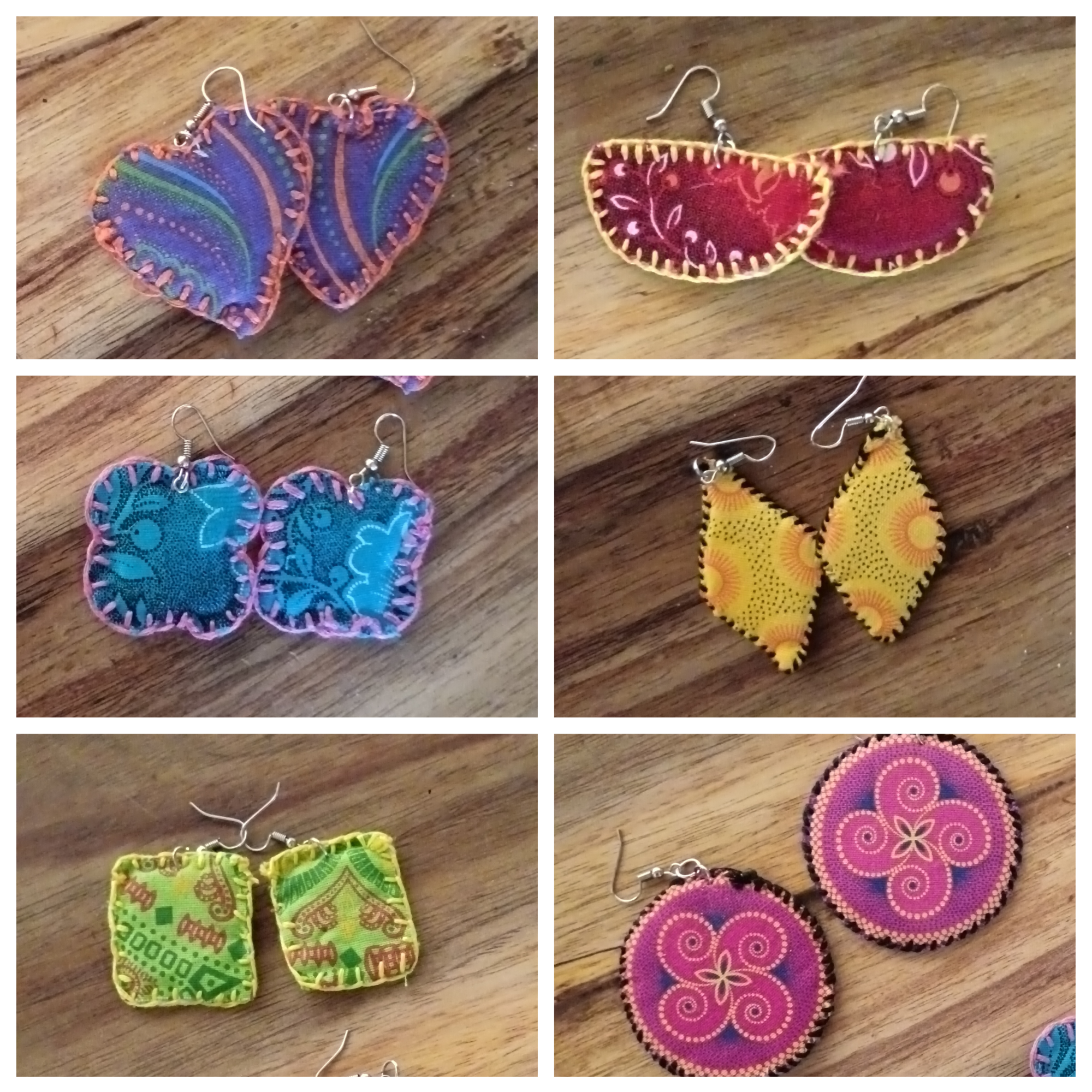 Earrings with various shapes: heart, circle, square, triangle, diamond, half circle, flower. All shapes come in either small or large size and are in various colours with the unique Shweshwe material.
